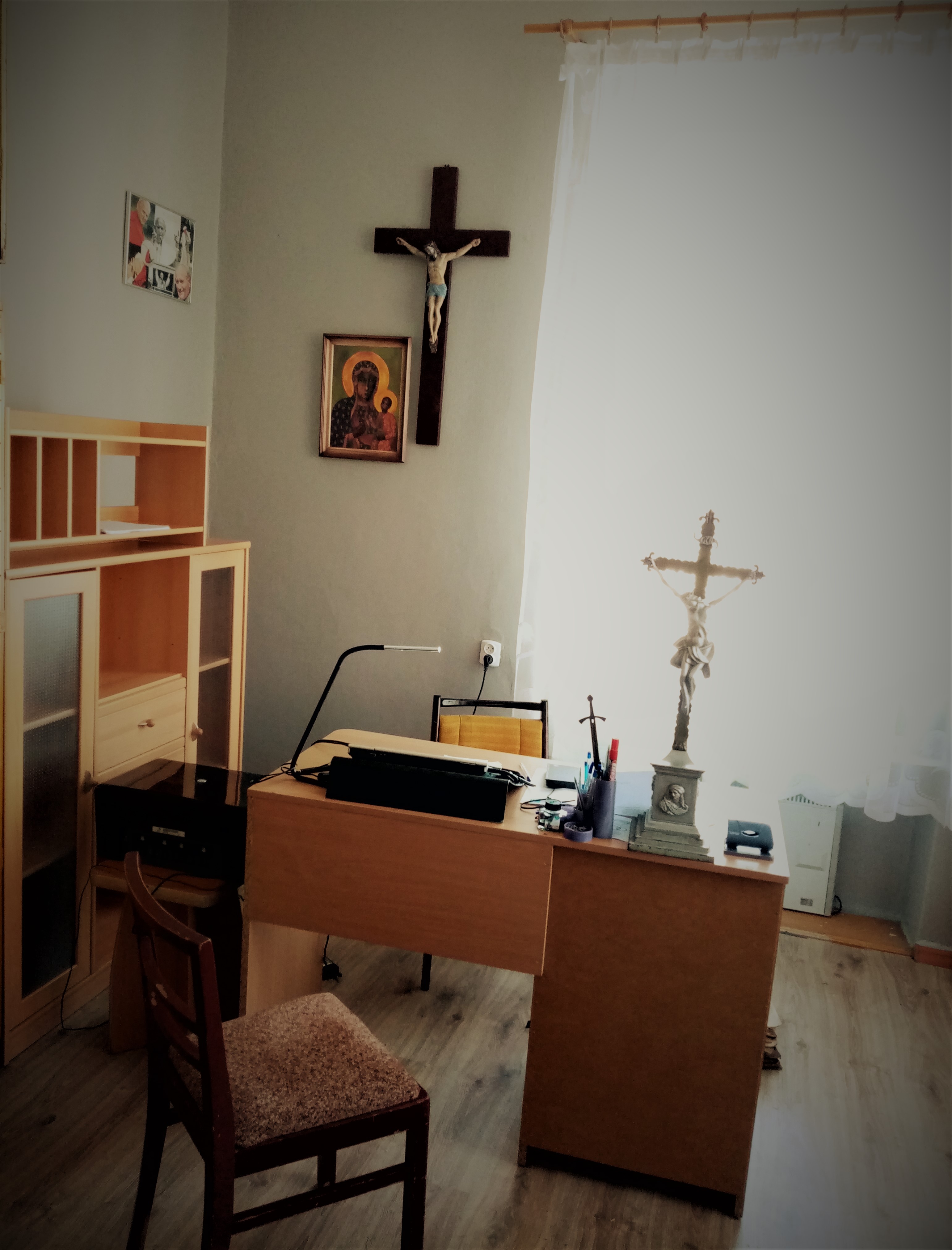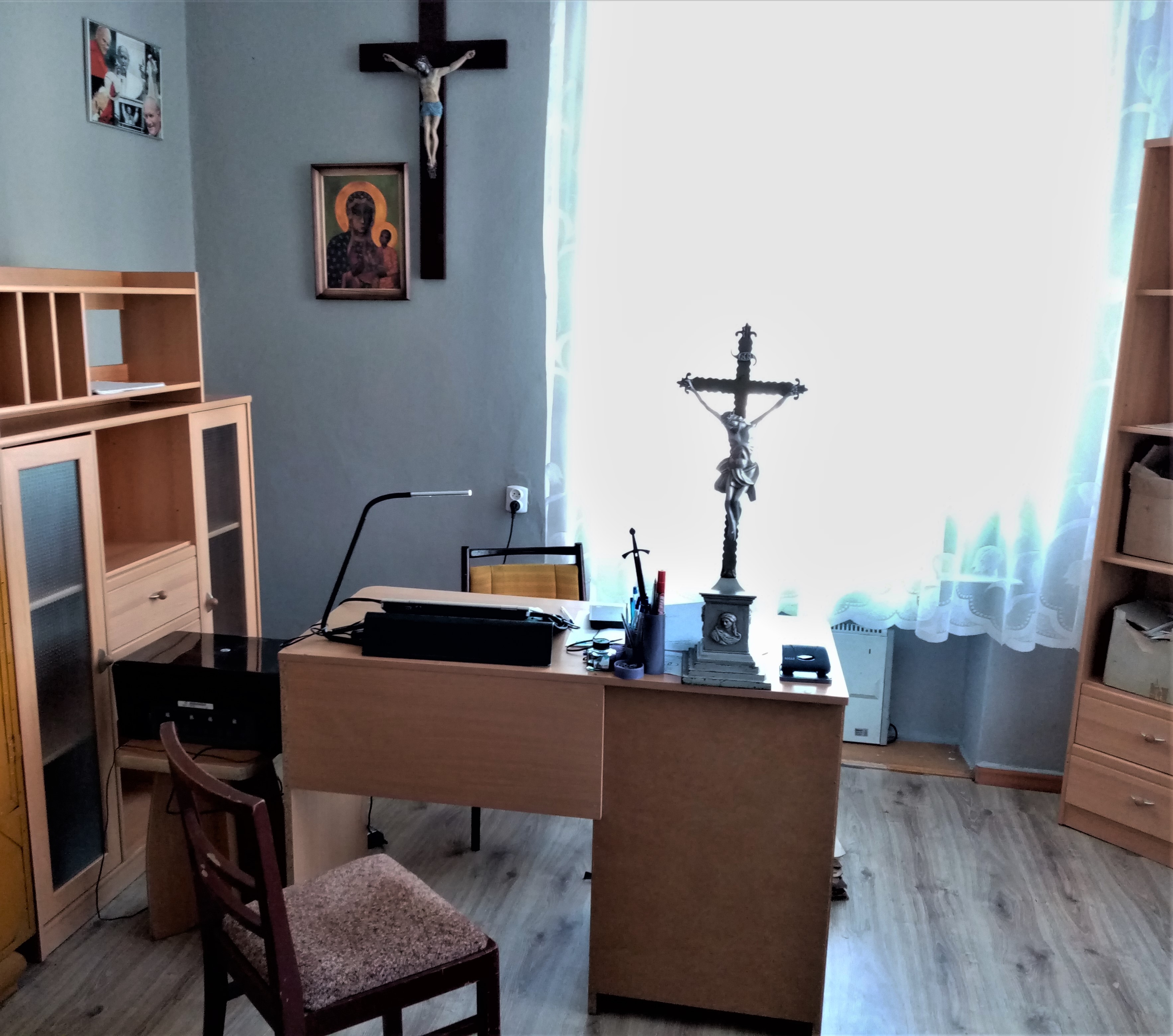 Na plebanii trwają prace renowacyjno-remontowe wnętrz, pomieszczenia plebanii zostały pomalowane, trwa także montaż paneli podłogowych. Na poniższym zdjęciu możemy podziwiać nowy wystrój kancelarii parafialnej: