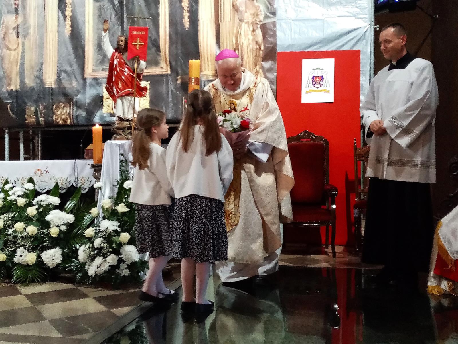 Księdza Biskupa kwiatami przywitały dzieci z parafii Świętej Trójcy.